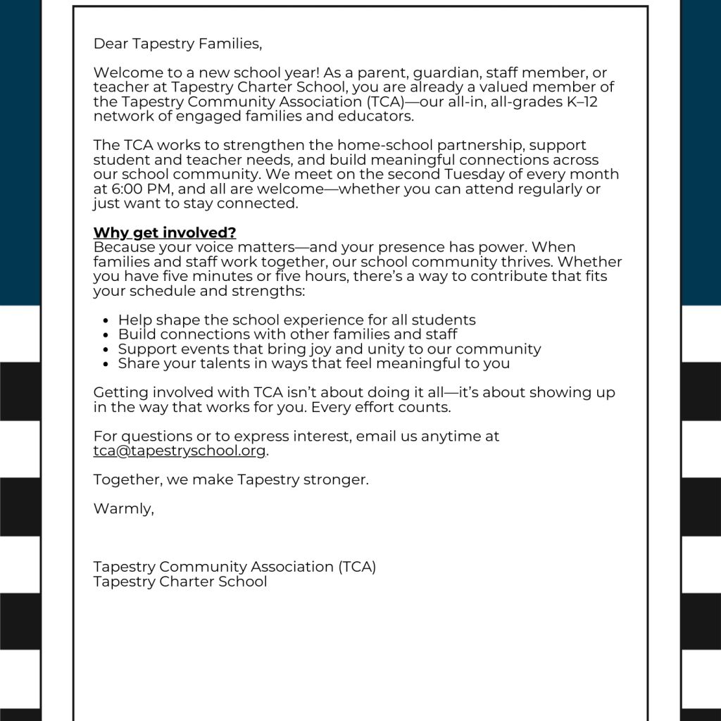 We value transparency, collaboration, and strong family partnership. Below you’ll find all Tapestry Community Association (TCA) meeting information, including meeting dates, posted agendas, and meeting minutes.